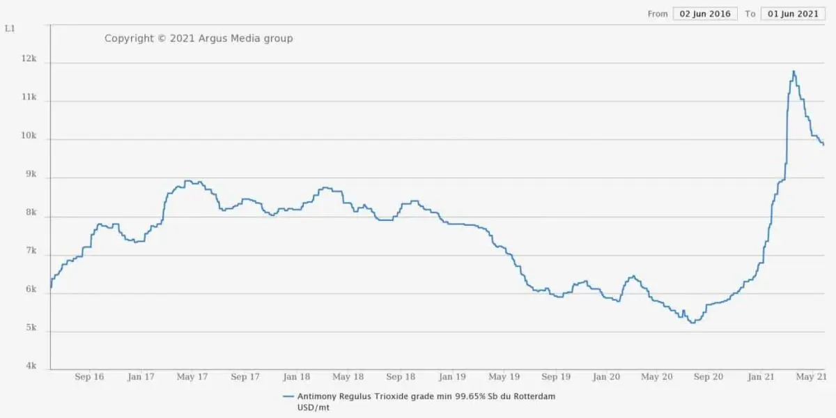 The worries about regulators evaporated like Gorillas in the Mist in the last quarter of 2020 and a stampede to rebuild stocks occurred sending buyers (notably in the US) into a feeding frenzy with Antimony becoming the hottest metal in the last six months (though tussling with Tin for that title) doubling in price from around $5,500 in late 2020 to nearly $11,000, from where it has eased back slightly.