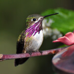 The adult male has a metallic green back and crown, but its most striking feature is the purple-magenta rays that may be erected to show a “whiskered” effect used to display dominance over other hummingbirds. The Calliope prefers high mountain areas and the female builds her nest over creeks or near roads next to streams or lakes, usually returning to the same nesting area every year.