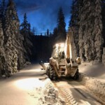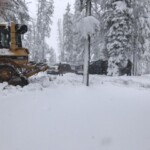 Late on Wednesday, a hunter stopped at the core shed on site after running into town to get snow chains and not being able to get back up to his hunting party. He was part of a larger group hunting on Mule Ridge when the storm hit. As soon as we learned they were stuck, we fired up our Cat dozer and backhoe and offered to open up the roads so they could get back home. It took us 20 staff hours in the deep snow but eventually everyone got down safely. You can see just how deep the snow is from the photos below.